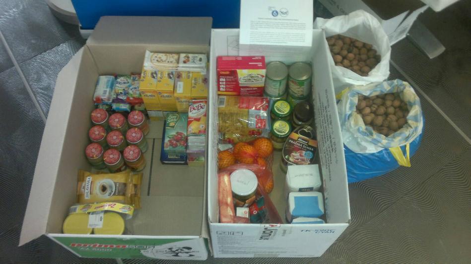 Potraviny, zeleninu, ovoce, cukrovinky, mléko a mléčné výrobky, kakao, konzervy, trvanlivé uzeniny, těstoviny, rýži a další potraviny, u nichž ještě neskončila doba expirace. Vítány jsou také čistící a hygienické prostředky.