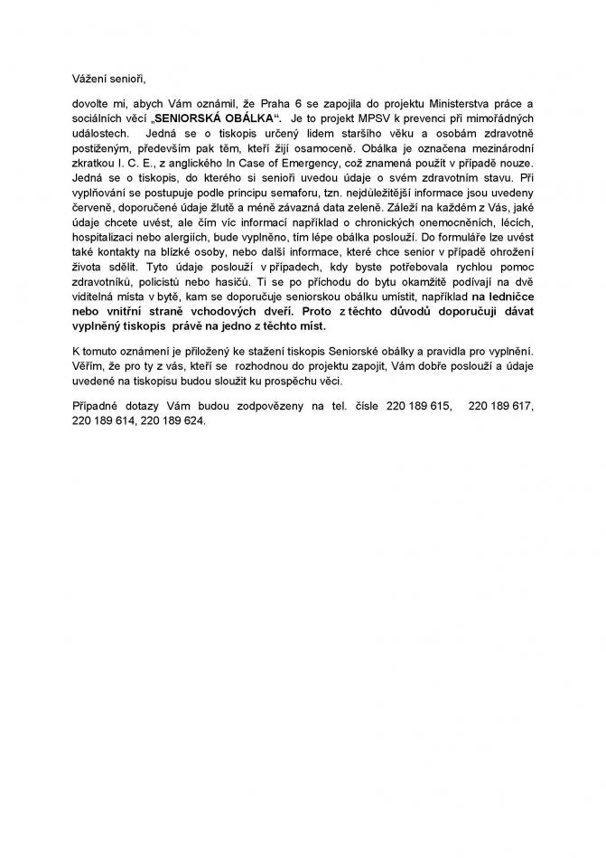 Praha 6 se zapojila do projektu Ministerstva práce a sociálních věcí „Seniorská obálka“. Jedná se o tiskopis určený lidem staršího věku a osobám zdravotně postiženým, především pak těm, kteří žijí osamoceně. Uvedou se do něj údaje o zdravotním stavu, které poslouží v případech potřeby rychlé pomoci zdravotníků, policistů nebo hasičů. Podrobnější informace se dočtete v přílohách.