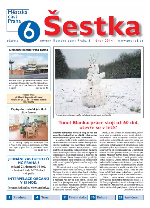 Právě vyšlo únorové číslo novin městské části Praha 6 - Šestka. Novinky, akce, pozvánky! Kdy se otevře tunel Blanka? A budou v Praze 6 platit parkovací zóny? Jak přihlásit dítě do mateřské školy? To vše a mnohem více se dočtete v únorové Šestce!