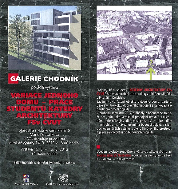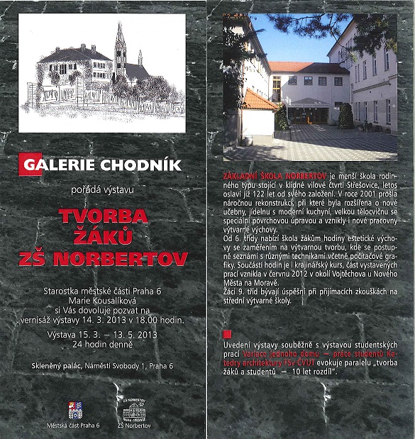 Už tento čtvrtek 14. 3. 2013 v 18.00 hodin začínají slavnostní vernisáží ve Skleněném paláci (náměstí Svobody 1, Praha 6) dvě unikátní výstavy. Tvorba žáků ze základní školy Norbertov a studentů architektury.